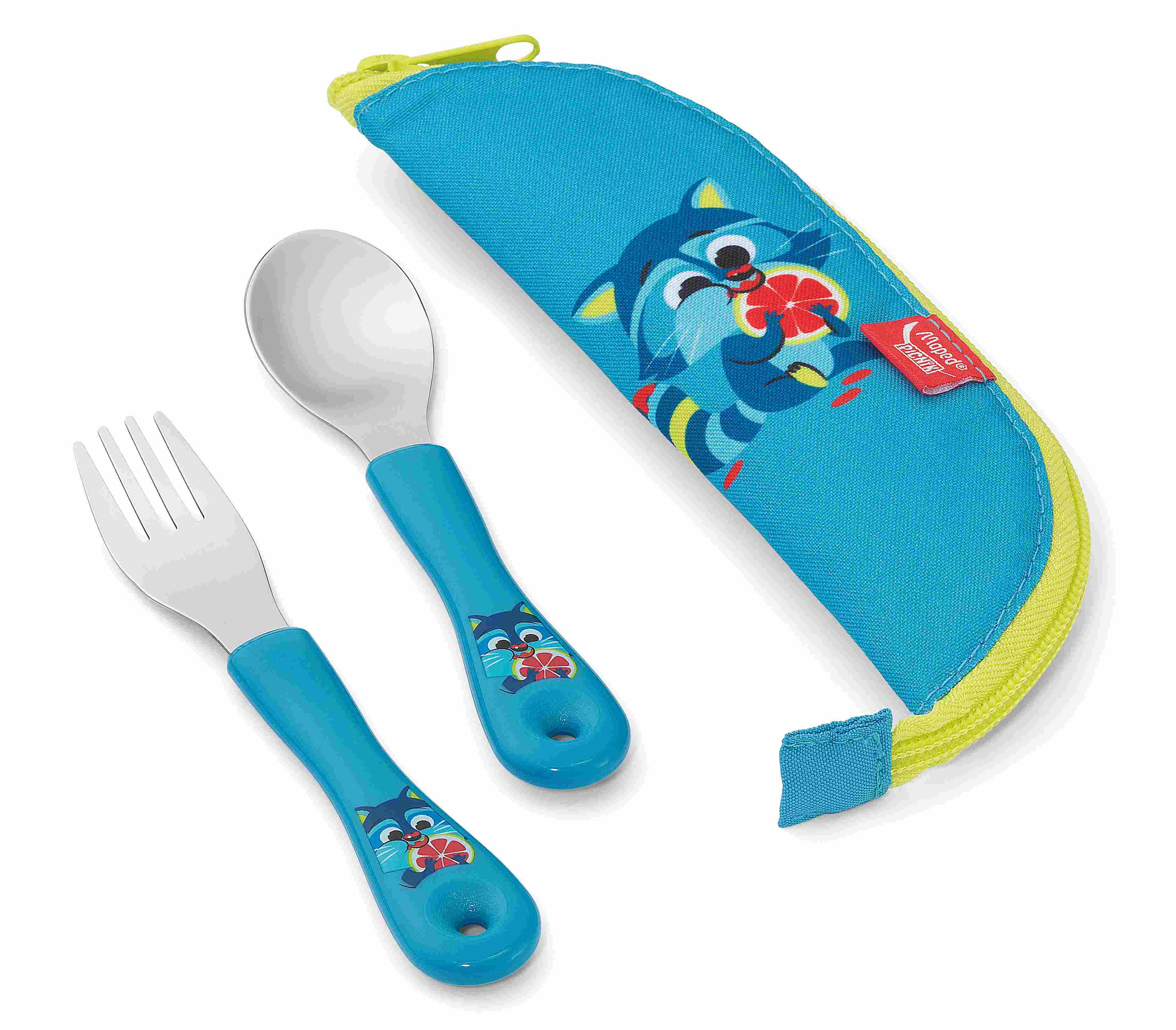 Sztućce zapakowane są w wygodny, tekstylny pojemnik, który pozwala utrzymać je zawsze w czystości. Są lekkie i mają niewielki rozmiar, dlatego swobodnie zmieszczą się w pudełku lunchowym Maped Picnik Miniz.