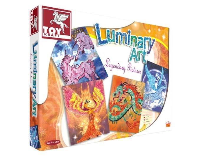 Piasek, cekiny i brokat to bardzo efektowne połączenie. Brokatowe tubki z klejem służą do robienia konturów rysunków. W zestawie występują w 4 kolorach. W zestawie jest również srebrny brokatowy puder, który użyty daje efekt połysku całego obrazu. Dzięki połączeniu wszystkich składników powstaną obrazy legendarnych zwierząt: Pegaz, Feniks, Jednorożec oraz Smok.