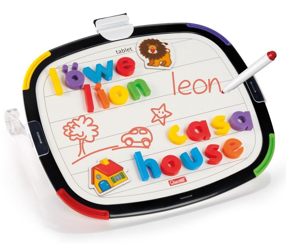 Zestaw zawiera tablicę magnetyczną, literki i obrazki. Jedna strona walizki to wyjątkowa tablica, na której można rysować obrazki specjalnymi mazakami, a z drugiej strony znajduje się tablica magnetyczna, do której można przyklejać literki i obrazki. Zabawka rozwija koordynację wzrokowo-ruchową, uczy koncentracji, twórczego myślenia. Dziecko poprzez zabawę uczy się literek i kolorów. Zawiera polskie litery.