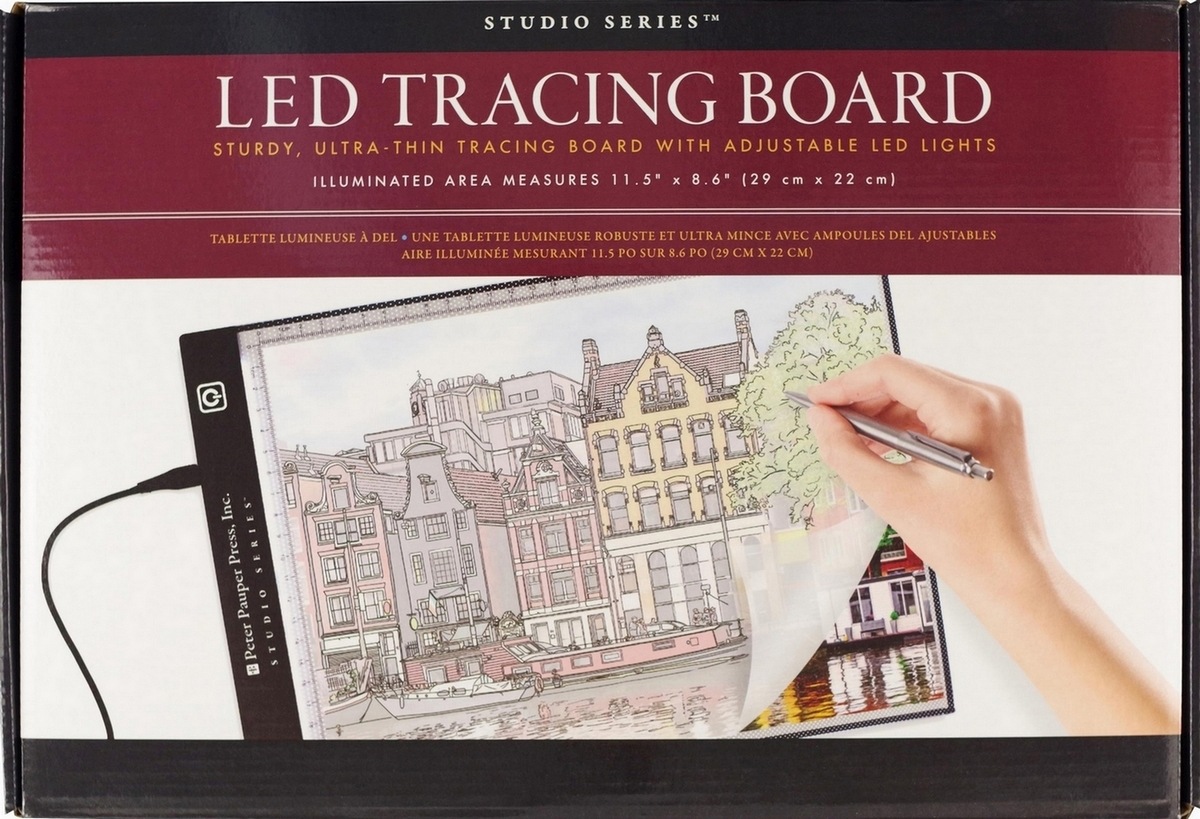 Lekka akrylowa tablica A4 z podświetleniem LED firmy Peter Pauper Press. Idealna do projektowania, rysowania, szkicowania, kopiowania, technik tworzenia, które wymagają dodatkowego podświetlenia, a nawet do oglądania zdjęć RTG. Diody LED z możliwością regulacji mocy świecenia dzięki dotykowemu przyciskowi. Zasilanie przez kabel USB 1,8 m, który można podłączyć do komputera, laptopa, power banku lub do wtyczki sieciowej (zasilacz nie jest w zestawie).