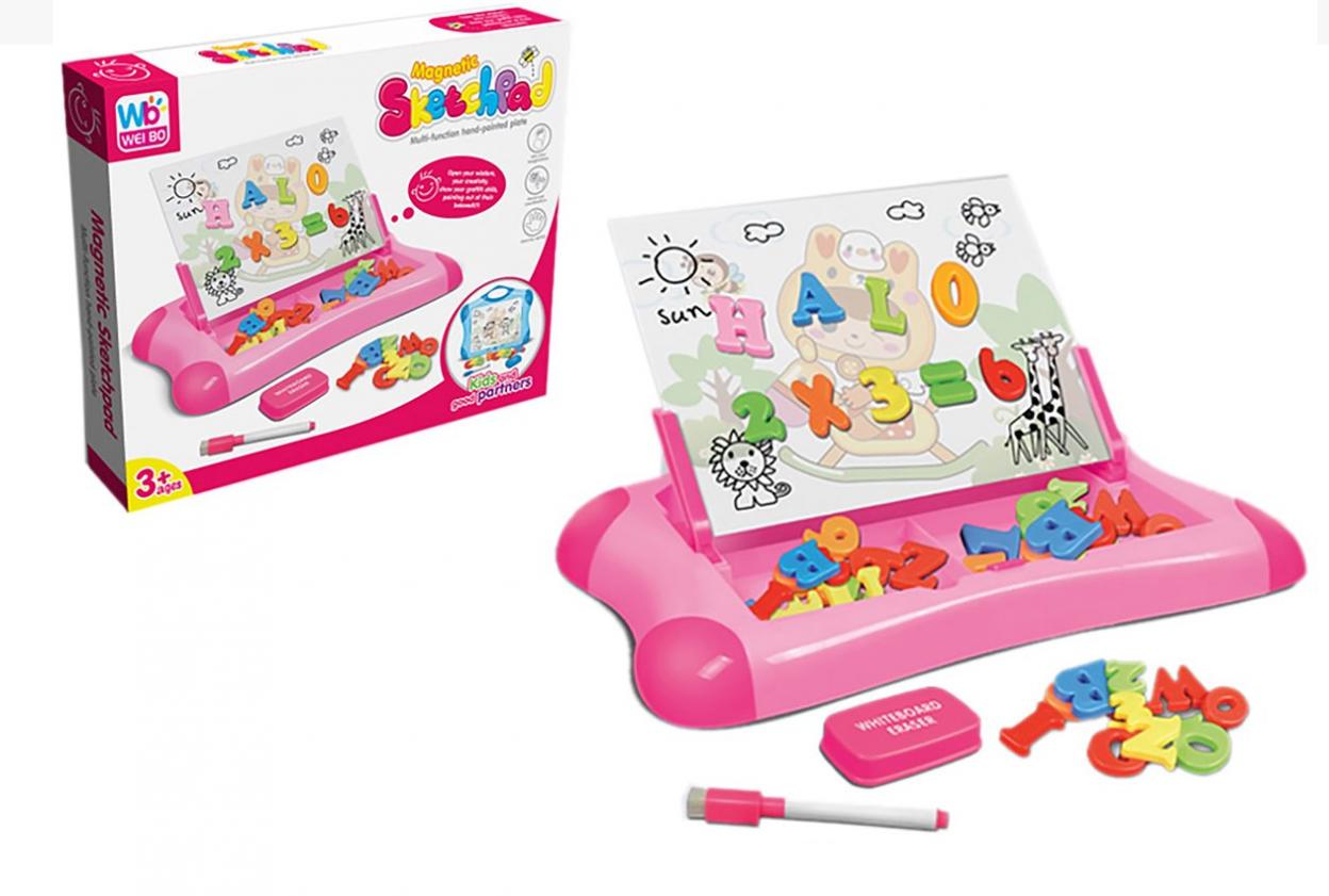 W zestawie znajduje się: mazak sucho-ścieralny, gąbka, 40 magnetycznych literek/cyferek.