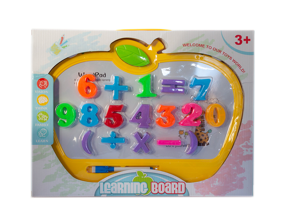 Magnetyczna tablica z dołączonymi cyferkami i znakami matematycznymi do układania.