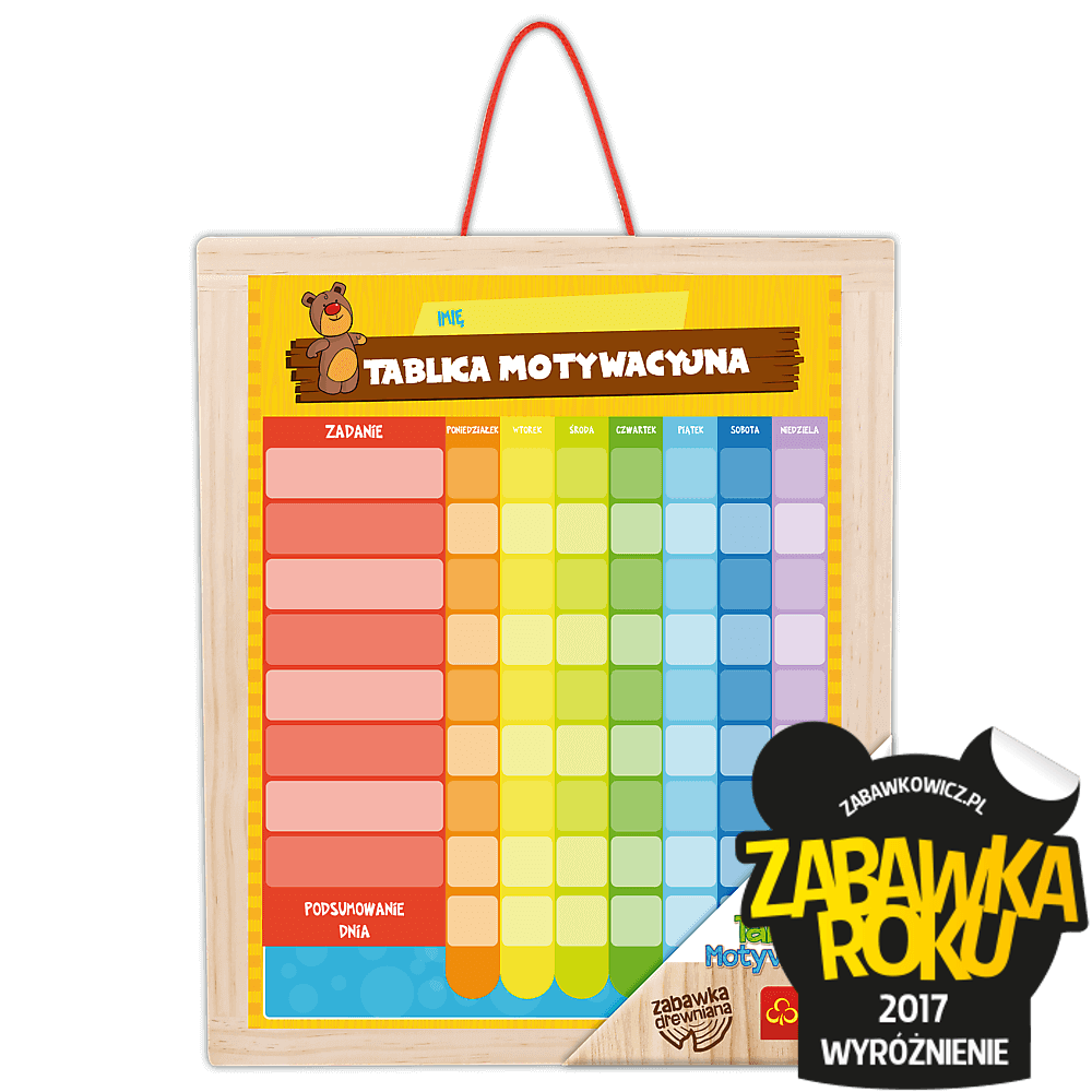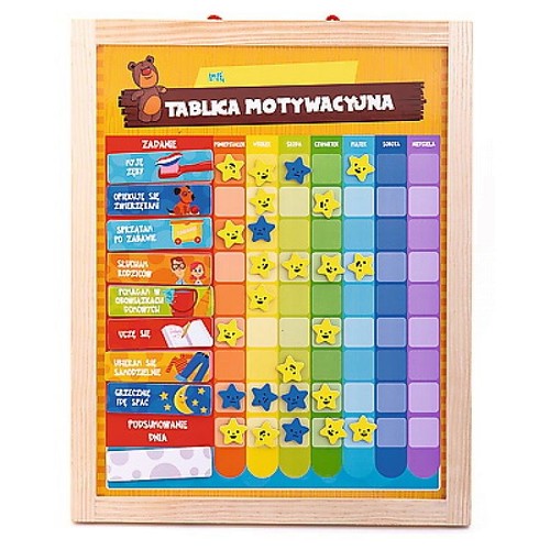 Tablica Motywacyjna z możliwością zawieszenia wyposażona jest w ponad 60 magnetycznych elementów, dzięki którym dziecko uczy się systematyczności wykonywanych działań