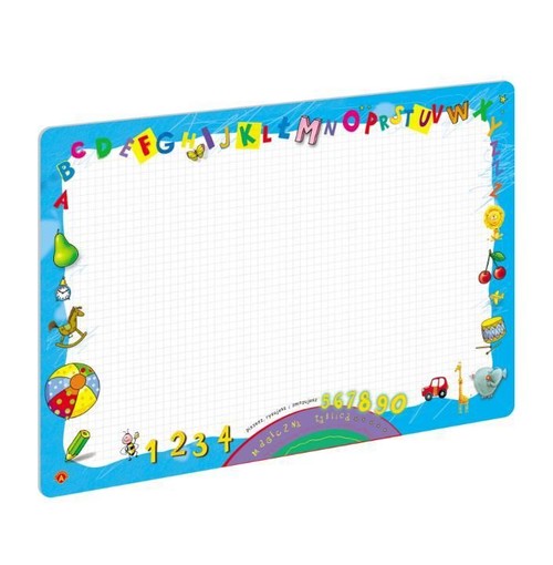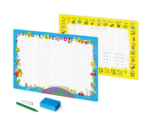 Dwustronna tablica do rysowania i pisania wraz z mazakiem i gąbką o wymiarach 47/33 cm. Rysunki wykonane na tablicy mazakiem, można łatwo zetrzeć na sucho gąbką. Znakomita pomoc do nauki pisania.