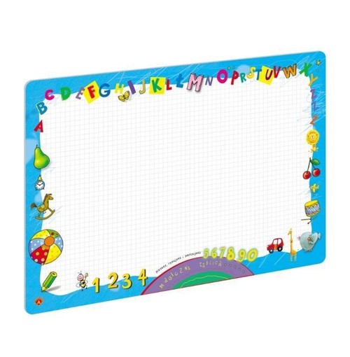 Dwustronna tablica do rysowania i pisania wraz z mazakiem i gąbką o wymiarach 33/23 cm. Rysunki wykonane na tablicy mazakiem, można łatwo zetrzeć na sucho gąbką. Znakomita pomoc do nauki pisania.