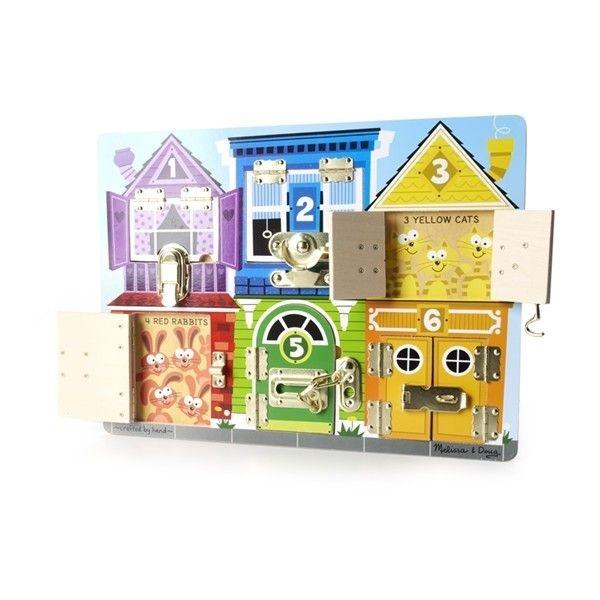 Ta tablica to kilka zabaw w jednym. Aby zobaczyć, co kryją za sobą drzwi należy je umieć otworzyć. Do otwarcia są różnego rodzaju zamki, kłódki i zatrzaski. Drzwi wejściowe są ponumerowane od jeden do sześciu. Po otwarciu dziecko widzi, kto mieszka w domku i ile jest zwierzątek. To zabawa, podczas której maluchy nabywają praktyczny umiejętności motorycznych, ćwiczą koordynację ręka-oko, uczą się kolorów, cyferek, uczą się również naz zwierząt. Produkt odznacza się wysoką jakością, co sprawia, że można cieszyć się zabawą przez długie lata.