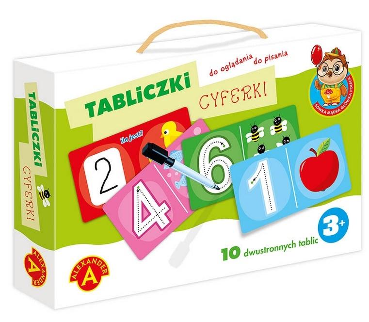 Zabawka składa się foliowanych tabliczek wykonanych z grubej i sztywnej tektury. Tabliczki przedstawiają cyfry oraz obrazki ilustrujące wartość prezentowanej cyfry. Dzięki zaznaczonym śladom maluszek może wykonywać już pierwsze próby odwzorowania cyfr. Z drugiej strony znajduje się białe pole, w którym malec może ćwiczyć już samodzielne wpisywanie.
