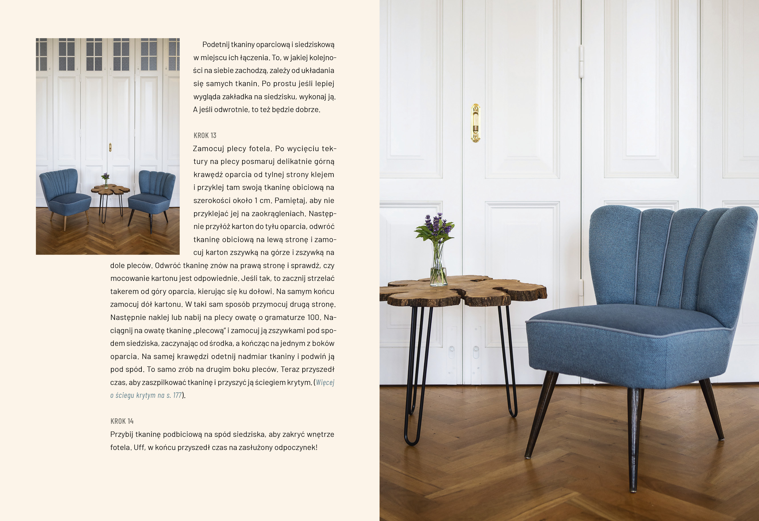 Mój ojciec prowadził mały zakład stolarsko-tapicerski. To właśnie u niego stawiałem pierwsze kroki, wykonywałem guziki tapicerskie na starej guzikarce, za które dostawałem pierwsze pieniądze. Pracuję na niej do dziś. Od wielu lat prowadzę pracownię mebli oraz Akademię Rzemiosła AKdesign, w której jestem szkoleniowcem. Tapicer w AKcji to moje flagowe warsztaty dla pasjonatów i fanów DIY. Każdy z uczestników przynosi ze sobą mały, stary mebel, a wychodzi z odrestaurowanym, niepowtarzalnym egzemplarzem (fragment wstępu)