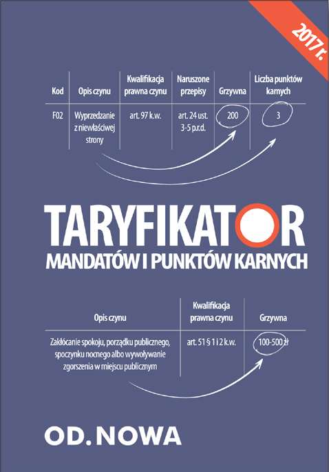 Najnowsze wydanie Taryfiaktora mandatów i punktów karnych zawiera aktualny wykaz naruszeń przepisów ruchu drogowego i liczbę punktów odpowiadającą tym naruszeniom, wysokość grzywien określonych w załączniku do Rozporządzenia Prezesa Rady Ministrów w sprawie wysokości grzywien nakładanych w drodze mandatów karnych za wybrane rodzaje wykroczeń. Wydanie zostało uzupełnione o przepisy o kontroli ruchu drogowego zamieszczone w Dziale V ustawy Prawo o ruchu drogowym. Największą zaletą tej pozycji jest zestawienie w jednej tabeli naruszenia przepisu z punktami karnymi, wysokością grzywny oraz kodem naruszenia. Wyszukiwanie ułatwia przejrzysty układ (w tym wizualizacja w postaci kolorowych znaków drogowych). Stan prawny: styczeń 2017 r.