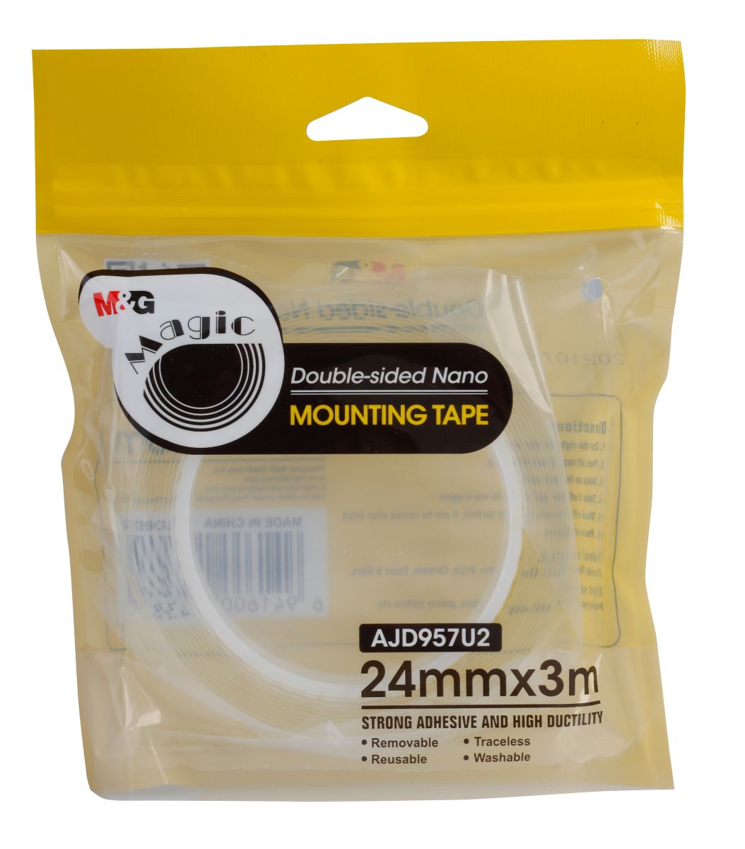 Przezroczysta, dwustronnie klejąca taśma żelowa Nano, zapewniająca bardzo mocną przyczepność i wielokrotne użycie.