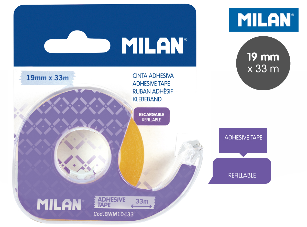Taśma samoprzylepna przezroczysta, lekko żółta na fioletowym dyspenserze do wielokrotnego użytku z metalowym ostrzem. Bardzo dobrze trzyma. Rozmiar taśmy: długość 33 m x szerokość 19 mm x średnica 5,5 cm.