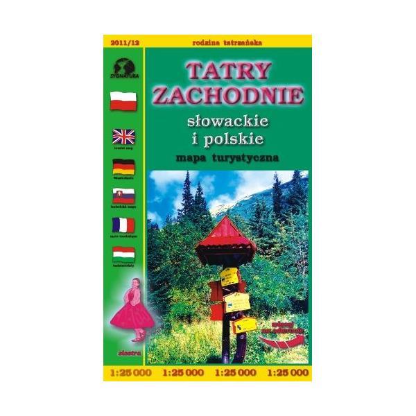Mapa Tatr Zachodnich, polskich i słowackich, w skali 1:25 000 jest jedyną polską mapą tego rejonu w skali 1:25 000. Mapa stanowi przedłużenie na zachód mapy Tatr Wysokich, obie można połączyć w efektowną całość.Legenda zawiera około 100 znaków. Mapa jest przebogata w nazwy fizjograficzne. Na obszarze Słowacji wszystkie nazwy mają polskie odpowiedniki. Plastyczne cieniowanie i rysunek rzeźby przystępnie pokazują ukształtowanie terenu. Siatka do GPS, winietki roślin i zwierząt, czasy przejść.Na rewersie oprócz informacji geograficznych o pasmie górskim, jest bardzo obszerny przewodnik po dolinach, słowackich i polskich, wraz z fotografiami schronisk i pełną informacją o nich. Na uwagę zasługuje mapa dojazdu, ułatwiająca polskim turystom dotarcie samochodem lub autobusem do wybranej doliny lub miejscowści u jej ujścia. Schemat szlaków, zasięg telefonów komórkowych, informator turystyczny i wielkie panoramy dopełniają całości. Liczne fotografie krajobrazów oraz winietki roślin i zwierząt uatrakcyjniają tekst