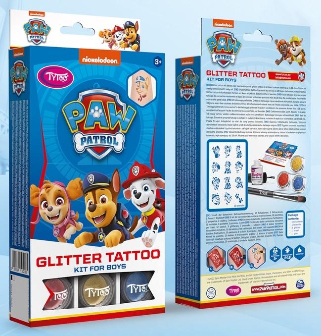Zestaw zawiera 12 tematycznych szablonów związanych z Psim Patrolem, pędzelek do nakładania brokatu, klej oraz trzy brokaty - czerwony, niebieski i żółty