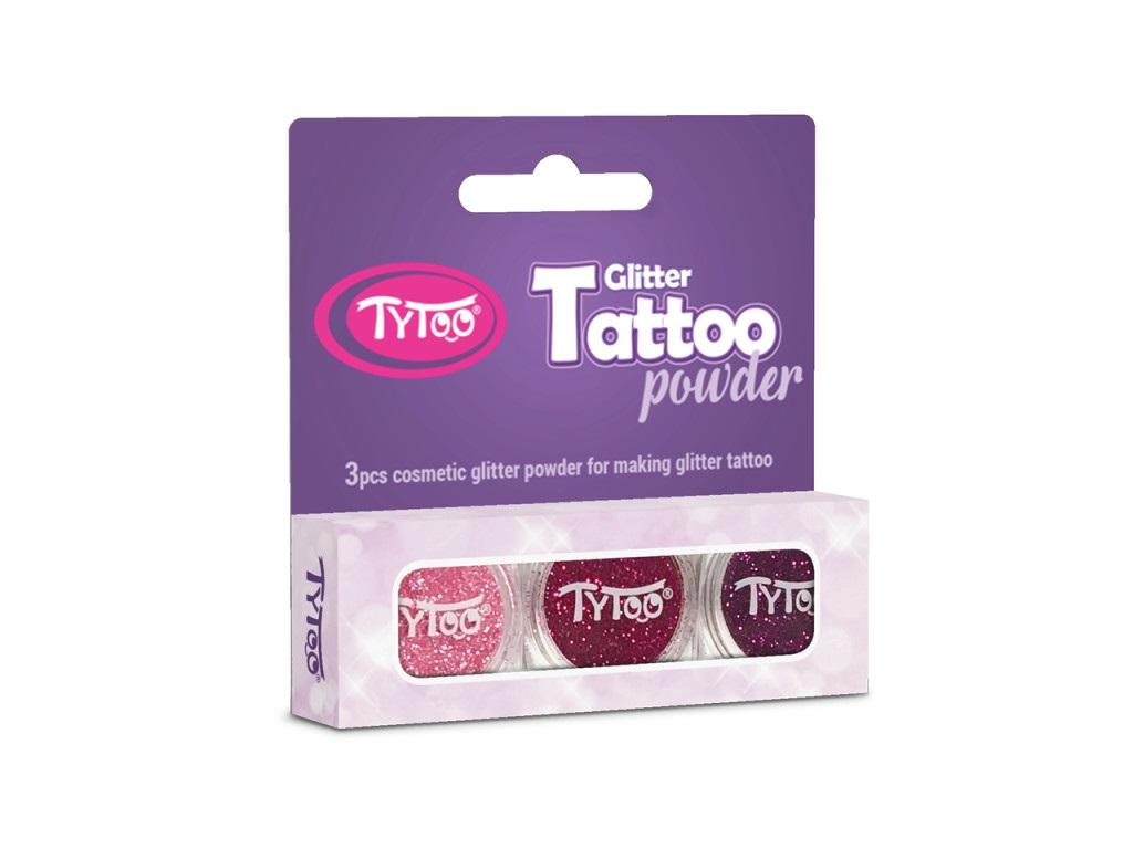 Tytoo to brokatowe pyły do samodzielnego wykonywania niezwykłych, tematycznych i brokatowych tatuaży! Zestaw zawiera 3 opakowania z brokatami w kolorach: różowy, czerwony i fioletowy.