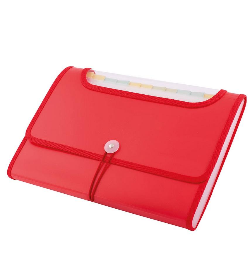 - teczka segregująca na dokumenty w formacie A4, zamykana na gumkę - wewnątrz posiada przegródki na dokumenty z wymiennymi etykietami do opisu zawartości - wykonana z mocnej folii PP - posiada okienko do podglądu zawartości - 12 przegródek