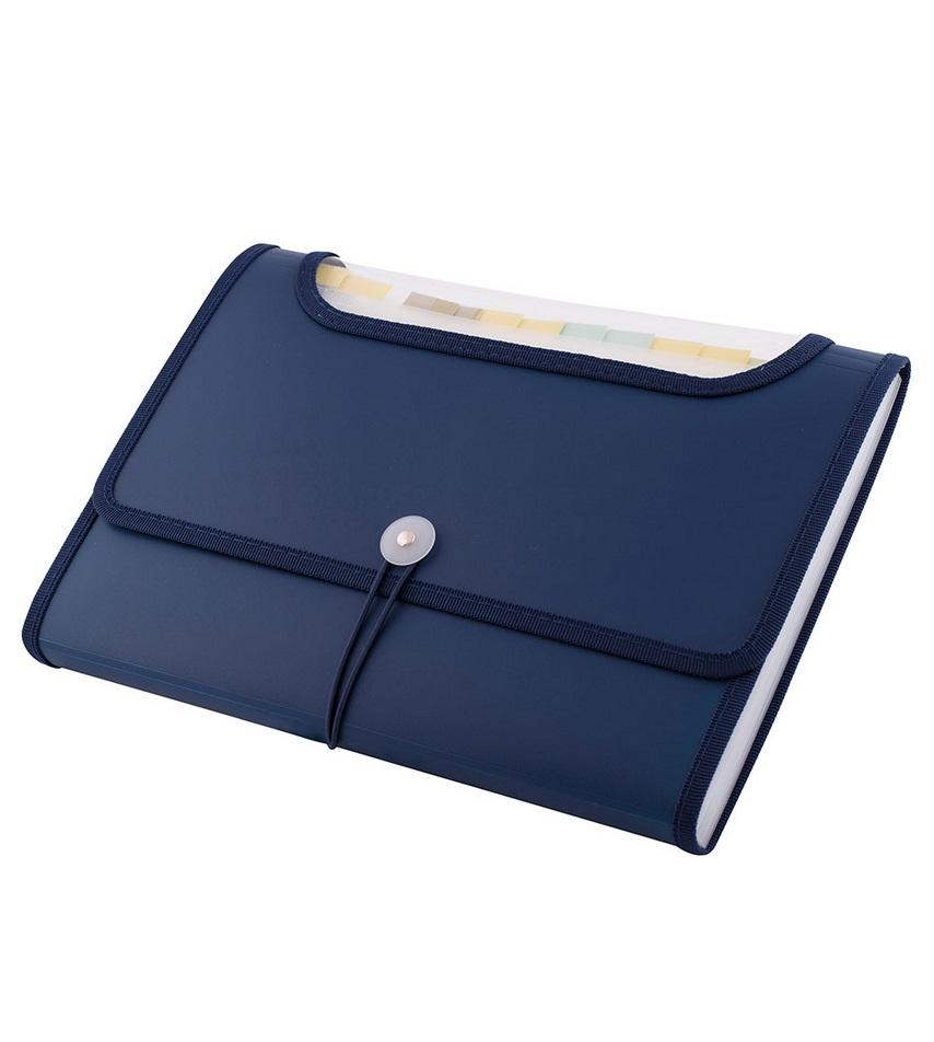 - teczka segregująca na dokumenty w formacie A4, zamykana na gumkę - wewnątrz posiada przegródki na dokumenty z wymiennymi etykietami do opisu zawartości - wykonana z mocnej folii PP - posiada okienko do podglądu zawartości - 12 przegródek