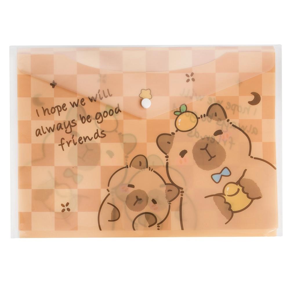 Praktyczna teczka w formacie A4 z wygodnym zatrzaskiem, idealna do przechowywania dokumentów. Ozdobiona uroczym motywem kapibary w beżowym kolorze, doskonale sprawdzi się w szkole, biurze lub domu.
