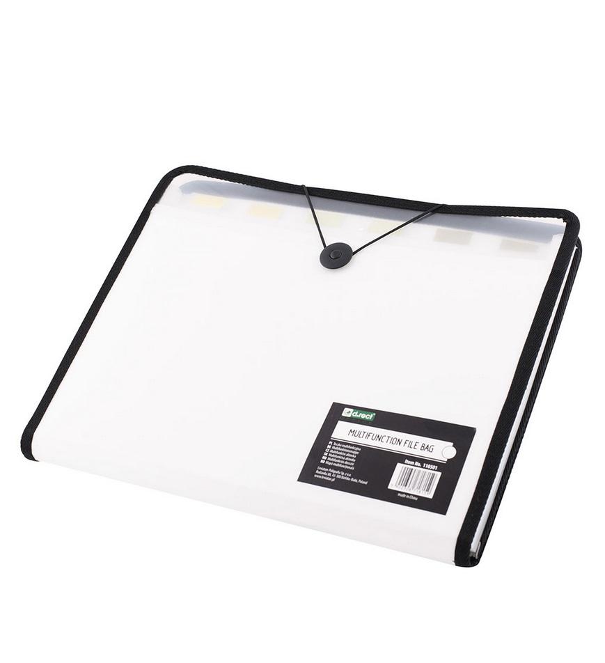 - rozmiar A4 - 7 przeźroczystych przegródek z wymiennymi etykietami do opisu zawartości - uchwyt na długopis i kieszeń na wizytówki - wewnątrz notatnik A4 - oprawa z grubego PP 750 mic z transparentnym okienkiem - zamykana na gumkę - biała