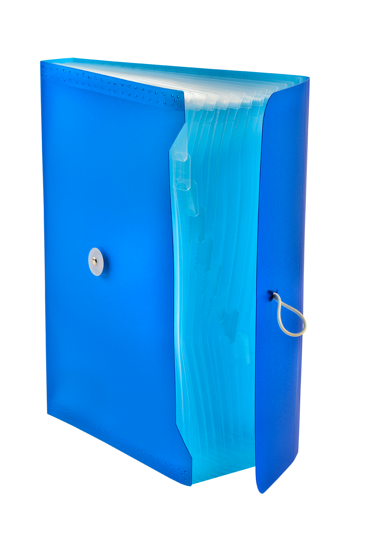 Teczka harmonijkowa PP z gumką, mieszcząca format A4. Teczka posiada 13 przegród. Wymiary teczki: 330x245x32 mm, grubość tworzywa PP: 0,60 mm. Dostępna w czterech kolorach (niebieski, czerwony, pomarańczowy, żółty). Opakowanie: folia 1 szt.
