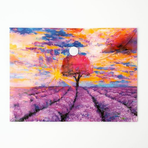 Ozdobna teczka kopertowa VISTA, wykonana z trwałego polipropylenu z nadrukiem w postaci impresjonistycznego pola lawendy. Zamykana na zatrzask typu napa. Dzięki pełnemu zadrukowi, zawartość teczki pozostaje niewidoczna na zewnątrz. Idealne rozwiązanie do przechowywania dokumentów lub niewielkich płaskich przedmiotów.
