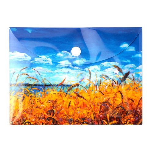 Ozdobna teczka kopertowa VISTA, wykonana z trwałego polipropylenu z nadrukiem w postaci impresjonistycznego widoku kołyszących się zbóż na tle lazurowego nieba. Zamykana na zatrzask typu napa. Dzięki pełnemu zadrukowi, zawartość teczki pozostaje niewidoczna na zewnątrz. Idealne rozwiązanie do przechowywania dokumentów lub niewielkich płaskich przedmiotów.