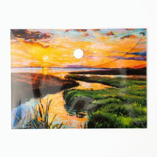 Ozdobna teczka kopertowa VISTA, wykonana z trwałego polipropylenu z nadrukiem w postaci impresjonistycznego widoku ujścia rzeki wpływającej do jeziora. Zamykana na zatrzask typu napa. Dzięki pełnemu zadrukowi, zawartość teczki pozostaje niewidoczna na zewnątrz. Idealne rozwiązanie do przechowywania dokumentów lub niewielkich płaskich przedmiotów.