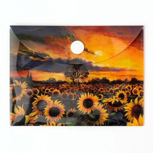 Ozdobna teczka kopertowa VISTA, wykonana z trwałego polipropylenu z nadrukiem w postaci pola słoneczników o zachodzie słońca. Zamykana na zatrzask typu napa. Dzięki pełnemu zadrukowi, zawartość teczki pozostaje niewidoczna na zewnątrz. Idealne rozwiązanie do przechowywania dokumentów lub niewielkich płaskich przedmiotów.