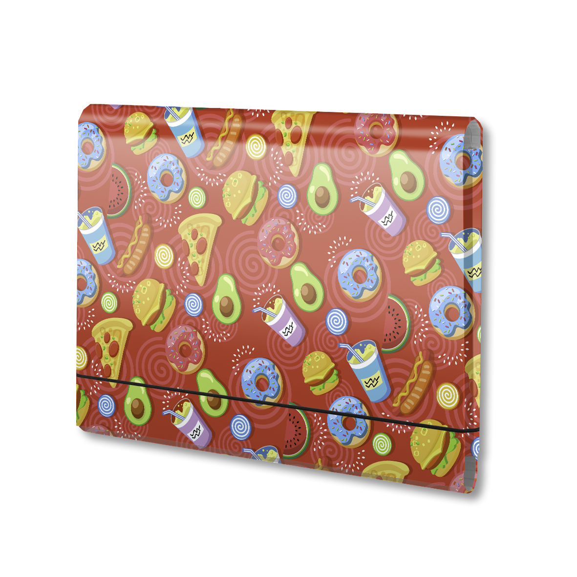 Teczka wykonana z tektury 1,7 mm, nitowane boki z okleinowymi krawędziami. Okleina uszlachetniona folią polipropylenową. Grubość grzbietu do 4 cm. Wymiary 32x24,5 cm.