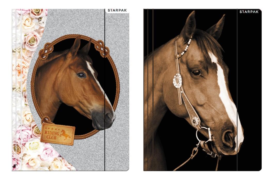 Teczka z gumką, mieszcząca blok kartek A4 o grubości do 30 mm. Na okładkach znajdują się zdjęcia koni z kolekcji Horses.