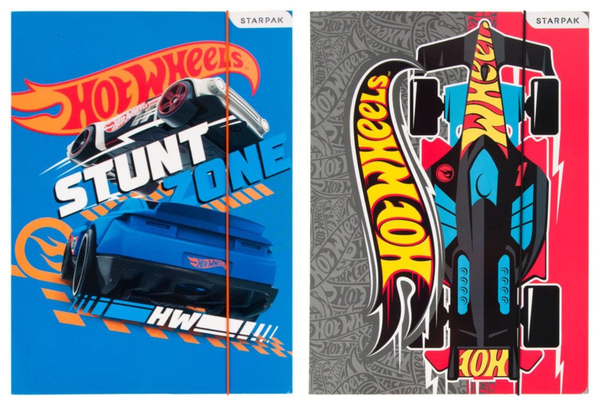 Teczka do przechowywania dokumentów. Otworki na gumkę zabezpieczone nitami. Gumka w oplocie z estetycznej tkaniny. Teczka ozdobiona grafiką Hot Wheels - laminowana.