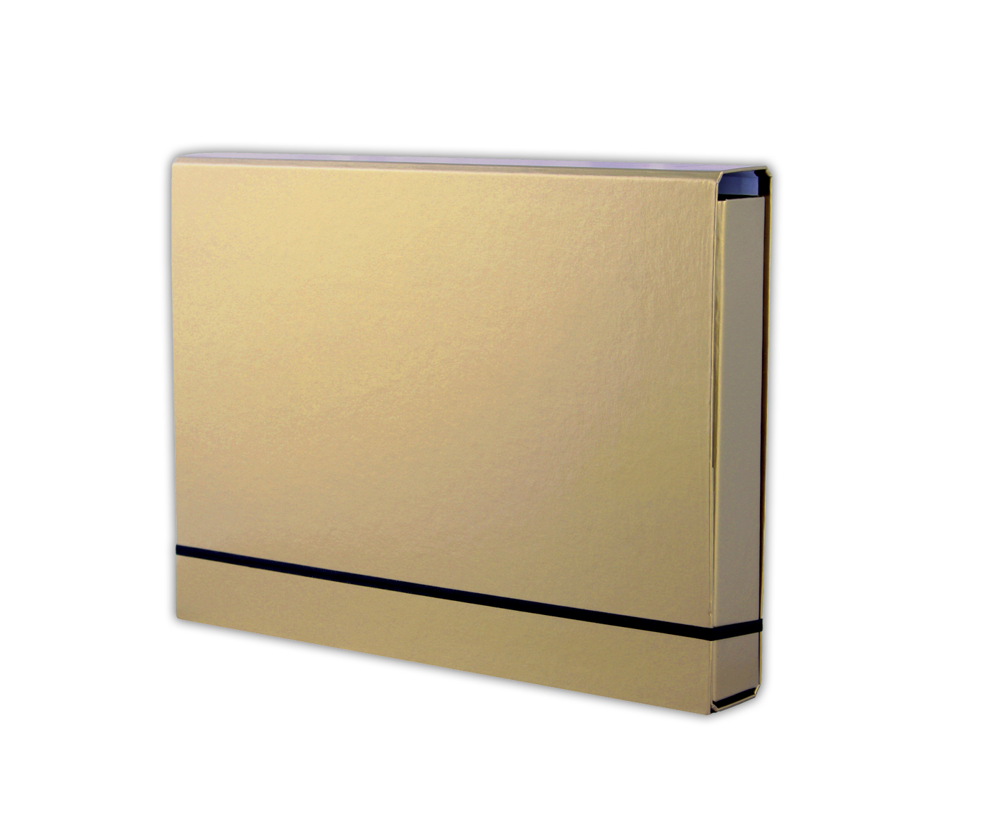 Wykonana z tektury 1,7 mm. Boki z okleinowanymi krawędziami, zapinana na gumkę. Wymiary 32 x 24 x 4.7 cm