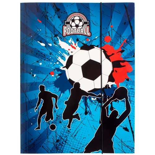 Teczka kartonowa zamykana na gumkę, ozdobiona motywami piłkarskimi.