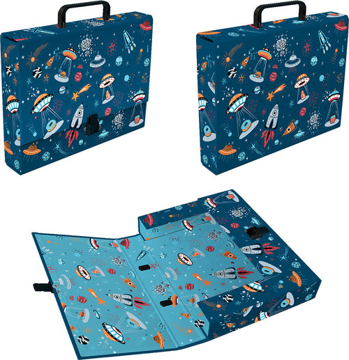 Teczka z rączką z kolekcji Kosmos. Jednokomorowa teczka wykonana z grubej, sztywnej tektury. Rączka i zamek wykonane z plastiku. Produkt idealny na bloki, prace plastyczne oraz wszelkie notatki. Doskonale chroni zawartość przed zniszczeniem. Teczka w formacie A4.