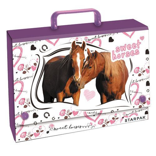 Teczka wyposażona w solidną rączkę, wzmocniona metalowymi nitami. Idealna na zajęcia pozaszkolne. Ozdobiona pięknymi zdjęciami koni.