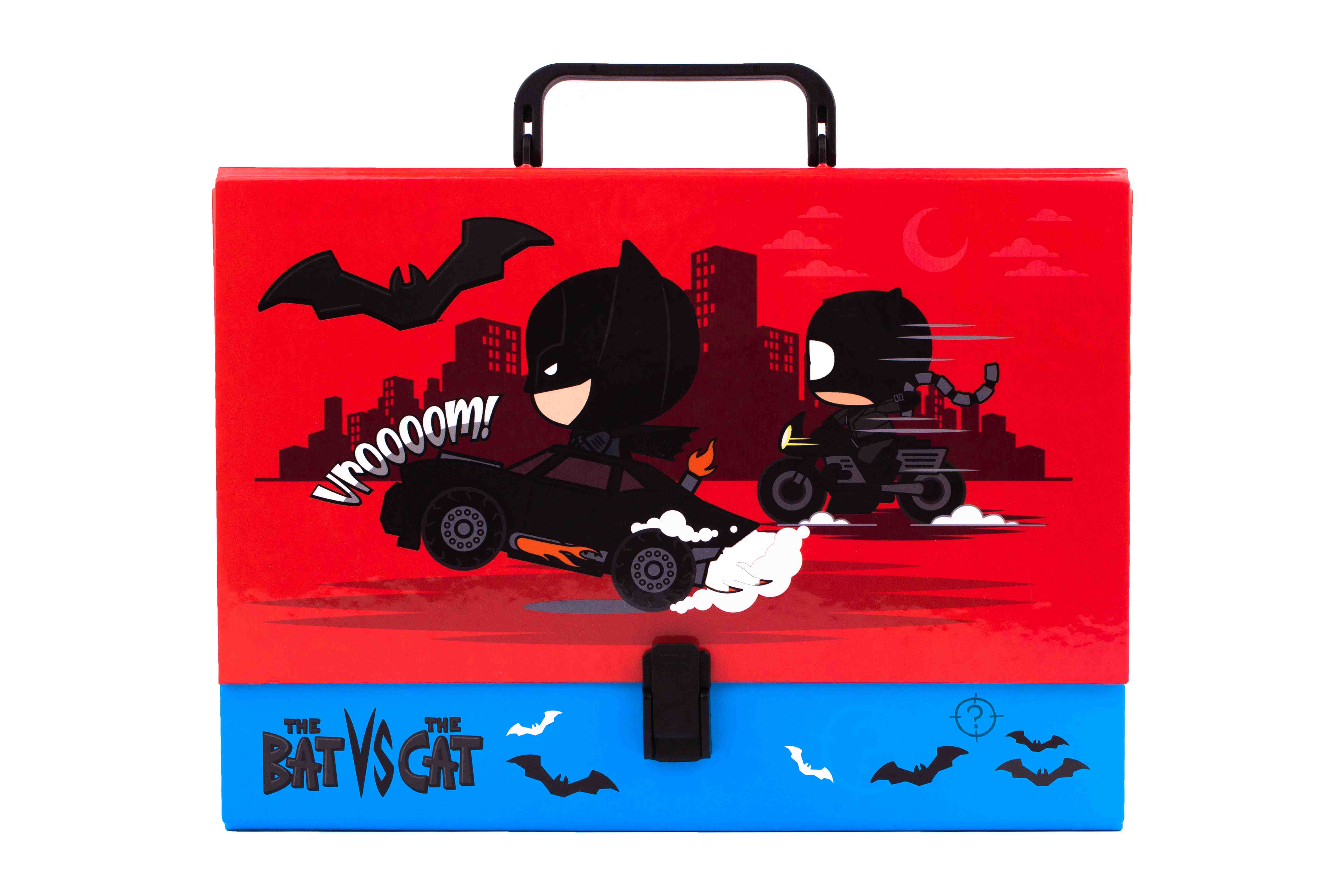 Teczka walizeczka - kartonowa/sztywna teczka z rączką, zapinana plastikowym mechanizmem z przodu. Doskonała dla przechowywania i przenoszenia zeszytów, brulionów, dokumentów, zdjęć, bloków rysunkowych, kredek i wielu innych. Kolorowa na zewnątrz, pokryta połyskową folią, wewnątrz zadruk w jednym kolorze dopasowany kolorystycznie do zewnętrznej części teczki. Motyw z serii Batman