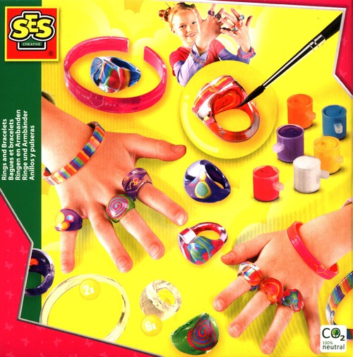 Zestaw zawiera: 6 pojemniczków z kolorowymi farbkami, pędzelek, 6 pierścionków i 2 bransoletki.