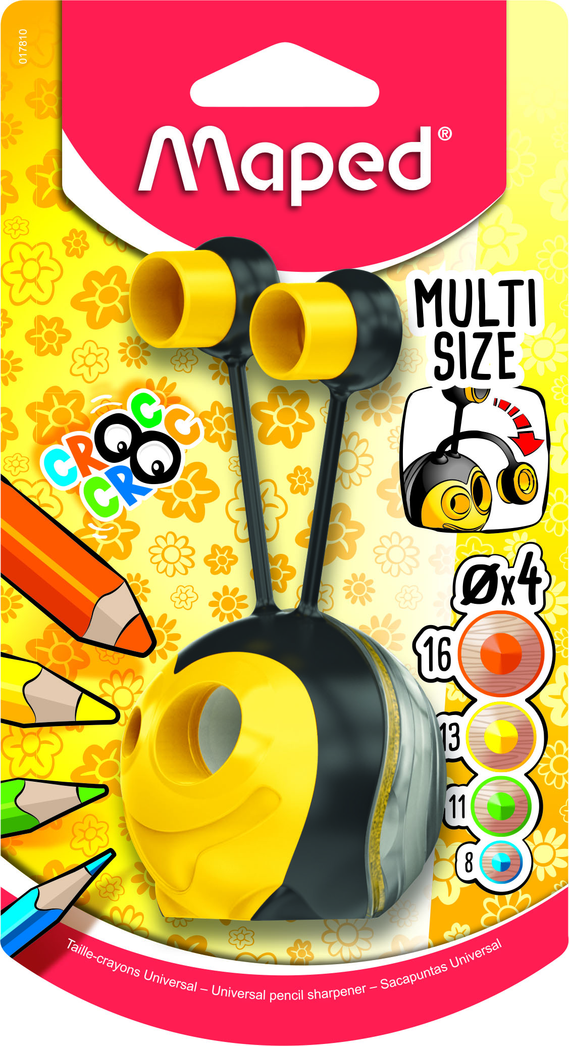 Temperówka CROC CROC UNIVERSAL w kształcie pszczółki. Unikalny i wyjątkowy pomysł marki Maped. Dwuotworowa temperówka z pojemnikiem, dzięki nasadkom w czułkach może temperować kredki lub ołówki aż w czterech średnicach: 8, 11, 13 i 16 mm. Przyjazny wygląd sprawia, że doskonale sprawuje się jako maskotka na domowym biurku i szkolnej ławce. Kolejny element kolekcji temperówek Croc