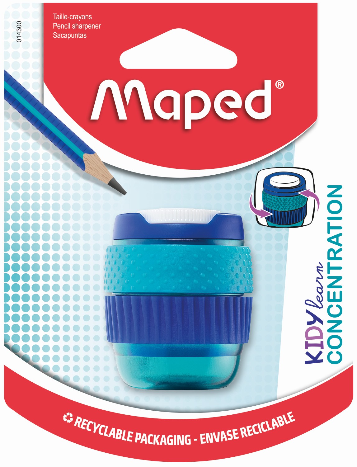 Temperówka Kidy Learn Concentration z jednym otworem. Zakręcany, obszerny pojemnik na ścinki gwarantuje niezawodne otwieranie i zamykanie, a przy tym zabezpiecza przed niekontrolowanym wysypywaniem się ścinków z pojemnika. Elementy sensoryczne to dwie gumowe opaski wokół pojemnika, o wyraźniej, wyczuwalnej fakturze, które można obracać w dwie strony.