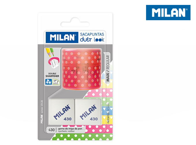 Podwójna temperówka (jedna standardowa temperówka i jedna temperówka MAXI). Temperówka posiada ostre i odporne ostrze ze stali węglowej, co czyni go idealnym dla wszystkich rodzajów ołówków. Ma również system ostrzy bezpieczeństwa, który zapobiega oderwaniu się ostrza od korpusu temperówki. Idealny do użytku w szkole. Zaprojektowany w Hiszpanii przez dział R & D firmy MILAN, miękka syntetyczna gumka kwadratowa. Może być używany do usuwania szerokiego zakresu pociągnięć ołówkiem ze wszystkich rodzajów papieru.