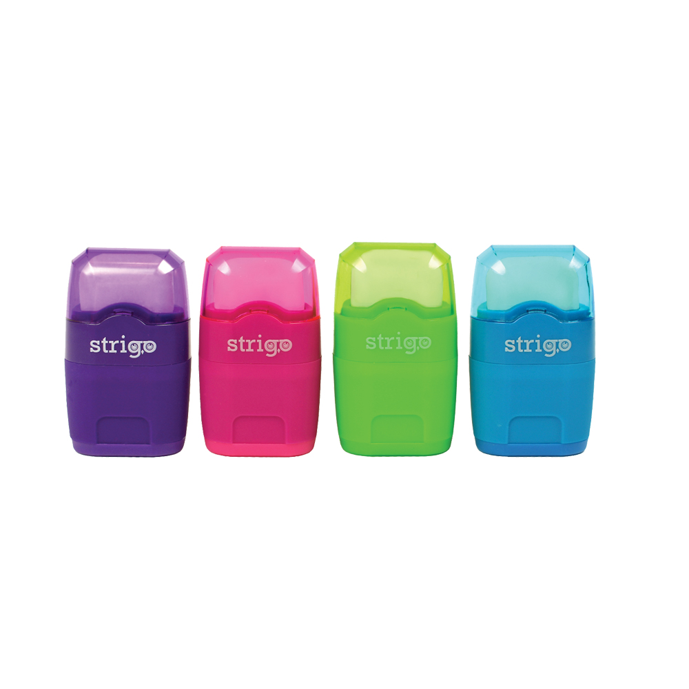 Temperówka na dwie grubości kredek z dużym pojemnikiem i gumką.