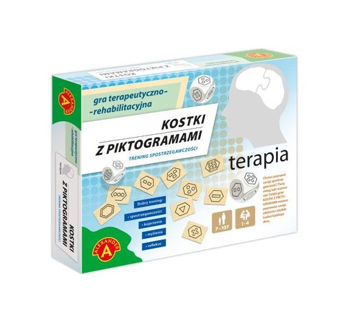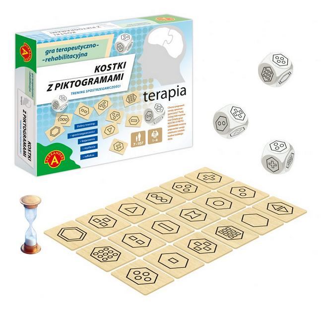 Terapia - Kostki z Piktogramami, ta zabawa ćwicząca koncentrację, spostrzegawczość, poprawiająca zdolności intelektualne. Rozgrywka oparta została na 3 kościach z piktogramami oraz 18 tabliczkach na których znajdują się identyczne piktogramy jak na kościach. Zadanie polega na jak najszybszym odnalezieniu na rozłożonych tabliczkach piktogramu wyrzuconego przez kości. Trzy warianty gry.