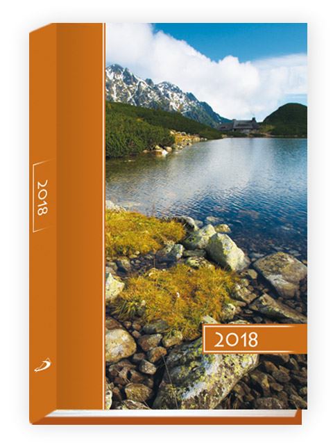 Terminarz na rok 2018, papier chamois, druk wnętrza w dwóch kolorach, perforowane narożniki kartek, tasiemka, każdy dzień na oddzielnej stronie, imieniny, święta, patron dnia, informacja o liturgii dnia, wschód-zachód słońca, fazy księżyca, myśl na każdy dzień, terminarz spotkań, miejsce na notatki, skrócone kalendarium miesiąca bieżącego, miejsce na adresy i telefony.