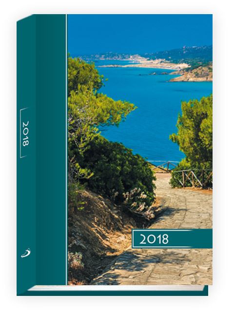 Terminarz na rok 2018, papier chamois, druk wnętrza w dwóch kolorach, perforowane narożniki kartek, tasiemka, każdy dzień na oddzielnej stronie, imieniny, święta, patron dnia, informacja o liturgii dnia, wschód-zachód słońca, fazy księżyca, myśl na każdy dzień, terminarz spotkań, miejsce na notatki, skrócone kalendarium miesiąca bieżącego, miejsce na adresy i telefony.