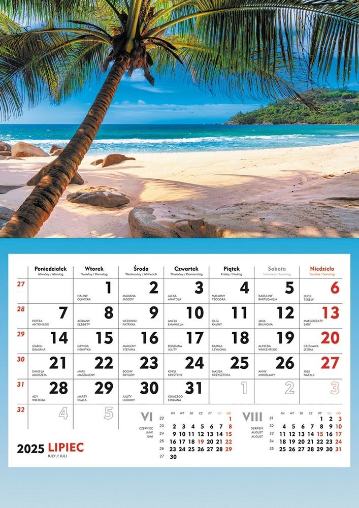 Główka pełnokolorowa, okienko przesuwane, nazwy miesięcy i tygodni w wersjach językowych, miejsce na nadruk reklamowy.