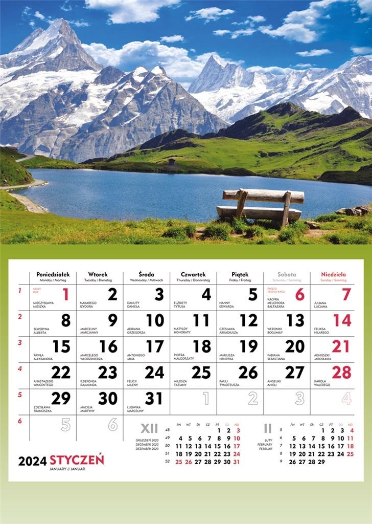 Główka pełnokolorowa, okienko przesuwane, nazwy miesięcy i tygodni w wersjach językowych, miejsce na nadruk reklamowy.