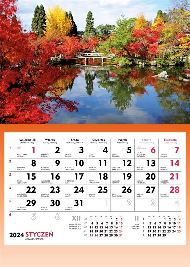 Główka pełnokolorowa, okienko przesuwane, nazwy miesięcy i tygodni w wersjach językowych, miejsce na nadruk reklamowy.