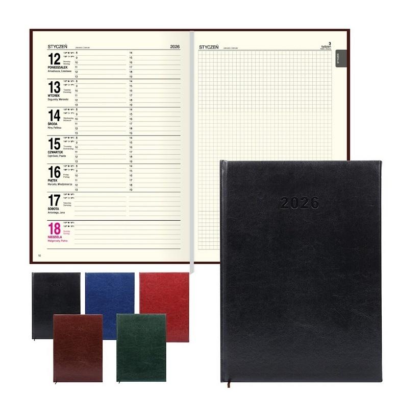 Kalendarz ma 112 strony i twardą, skóropodobną okładkę, która chroni wnętrze przed zniszczeniem, zapewniając jednocześnie elegancki wygląd. Układ środka jest niezwykle funkcjonalny cały tydzień ma swoją stronę, a cała druga strona jest poświęcona na notatki, co ułatwia organizację i planowanie.