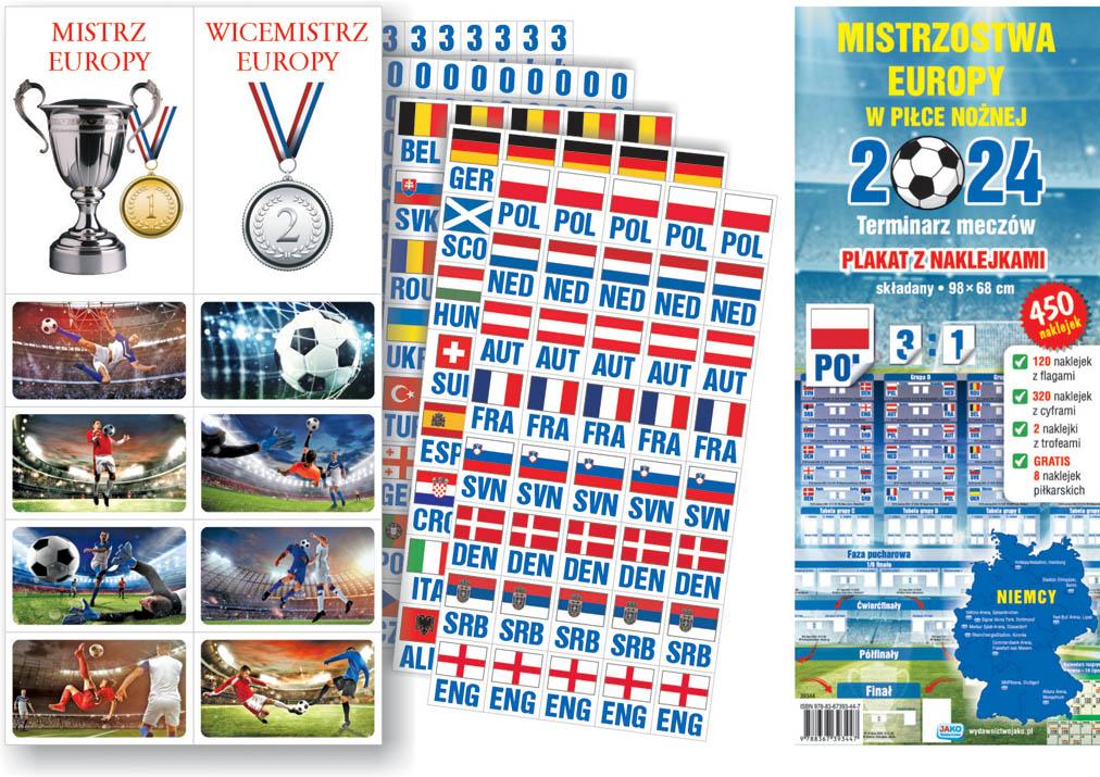 Terminarz rozgrywek z naklejkami to praktyczny informator dla każdego fana futbolu. Zawiera on wszystkie istotne informacje dotyczące meczów: daty, godziny oraz miejsca ich rozgrywania, co czyni go niezastąpionym narzędziem dla każdego pasjonata piłki nożnej. Tabela uzupełniona naklejkami wyników i flagami drużyn świetnie sprawdzi się jako estetyczny plakat na ścianę. Zestaw składa się ze dużego, składanego arkusza o wymiarach 98 x 68 cm oraz 420 naklejek (w tym 120 naklejek z flagami, 320 naklejek z cyframi, 2 naklejek z trofeami oraz 8 naklejek piłkarskich). Naklejki stanowią dodatkową atrakcję, jednocześnie wpływając pozytywnie na estetykę efektu końcowego. - Produkt wykonany w Polsce z wysokiej jakości materiałów. - Napisy w języku polskim. - Dodatkowo, przejrzysty kalendarz z godzinami i ilością spotkań danego dnia. - Poglądowa mapa Niemiec z lokalizacją stadionów, na których rozgrywają się spotkania. - Instrukcja uzupełniania terminarza - idealna do poznania przebiegu rozgrywek i właściwej punktacji. INSTRUKCJA. Wklej na planszy naklejki z flagami drużyn oraz naklejki wyników meczów zgodnie z przebiegiem turnieju. FAZA GRUPOWA. Po rozegraniu spotkań należy uzupełnić naklejkami wyniki meczów. Po zakończeniu wszystkich meczów fazy grupowej i ustaleniu miejsc w grupach przez poszczególne drużyny należy uzupełnić tabele grup naklejkami z flagami oraz naklejkami z liczbą zdobytych bramek i punktów. Za zwycięstwo przyznaje się trzy punkty, za remis jeden punkt, a o kolejności w grupie decyduje suma zdobytych punktów. W przypadku gdy dwie lub więcej drużyn zdobędzie tę samą liczbę punktów (po rozegraniu wszystkich meczów w grupie), o kolejności decydują kryteria ustalone przez organizatora turnieju. FAZA PUCHAROWA. W wyznaczonych miejscach meczów 1/8 finału należy wkleić naklejki z flagami drużyn, które w fazie grupowej zajęły: 1. miejsce, 2. miejsce, oraz flagi czterech najlepszych drużyn spośród tych, które zajęły 3. miejsca w grupach (o kolejności decydują kryteria ustalone przez organizatora turnieju). Po rozegraniu spotkań należy uzupełnić naklejkami wyniki meczów. Jeśli po upływie regulaminowego czasu 90 minut oraz dogrywki (dwa razy po 15 minut) nie padnie rozstrzygnięcie, wykonuje się serię rzutów karnych. Jeśli w danym meczu spotkanie zostanie rozstrzygnięte przez rzuty karne, należy w dodatkowym miejscu obok wyniku meczu wkleić naklejki z wynikiem rzutów karnych (cyfry w nawiasach). Po rozegraniu kolejnych spotkań (ćwierćfinałów, półfinałów i finału) należy wklejać naklejki zwycięskich drużyn oraz uzupełniać wyniki meczów zgodnie z powyższym schematem. Obok zwycięskiej drużyny turnieju (mistrza Europy) należy wkleić naklejkę z pucharem i złotym medalem, a obok wicemistrza naklejkę ze srebrnym medalem.