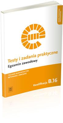 Publikacja zawiera 5 zestawów testowych przygotowujących do egzaminu zawodowego potwierdzającego kwalifikację B.16 (Wykonywanie robót zbrojarskich i betoniarskich) w zawodach betoniarz-zbrojarz i technik budownictwa. Każdy zestaw składa się z 40 zadań testowych i zadania praktycznego, sprawdzających wiedzę i umiejętności z zakresu zdawanej kwalifikacji. Na końcu publikacji zamieszczono klucz odpowiedzi do testów.