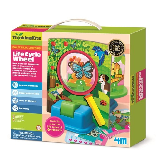 Koło cyklu życia 4M Jak rozwijają się organizmy? Poznaj fazy rozwoju roślin i zwierząt dzięki kołu cyklu życia. Zawartość: talerz obrotowy, dekoracyjna karta z otworem-lupą, 6 zestawów kart związanych z cyklem życia zwierząt i roślin, instrukcja